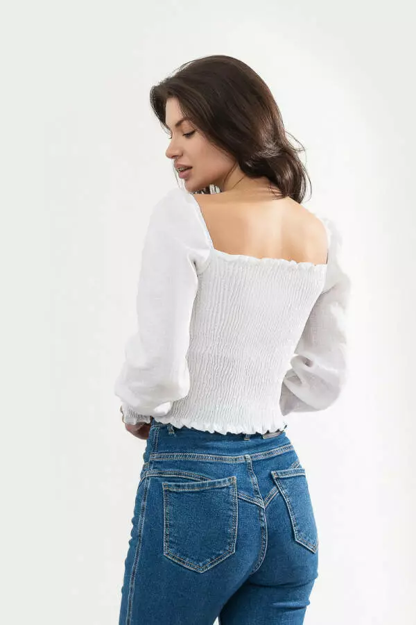 Дизайн блузи відзначається об'ємними рукавами з буфами, які додають образу особливого шарму та роблять її справжньою родзинкою. Буфи надають рукавам об’єм і створюють легкий, романтичний стиль, додаючи жіночності та вишуканості. Такий фасон підкреслює лінії плечей, роблячи образ виразнішим, а класичний білий колір надає відчуття чистоти та свіжості, що дозволяє легко поєднувати блузу з різними елементами гардеробу.