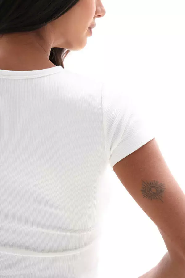 Ця футболка – відмінний вибір для тих, хто цінує якість, натуральні матеріали та стильні рішення. М'який бавовняний рубчик додає образу особливого шарму та текстурної привабливості.