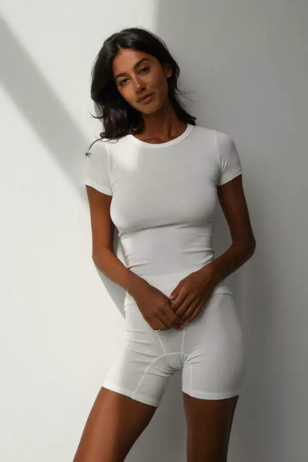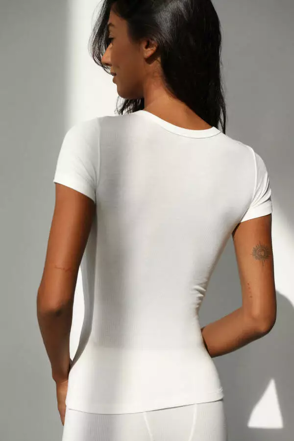 Футболка має класичний крій із короткими рукавами та округлим вирізом горловини, що підходить для будь-якого типу фігури. Вільний, але елегантний силует забезпечує зручність у носінні, не обмежуючи рухів і даруючи відчуття комфорту. Завдяки рельєфній текстурі у вигляді рубчика, футболка виглядає цікаво та надає образу додаткової текстури, що робить її ідеальною базою для багатошарових комплектів або самостійним акцентом у стильному повсякденному луці.