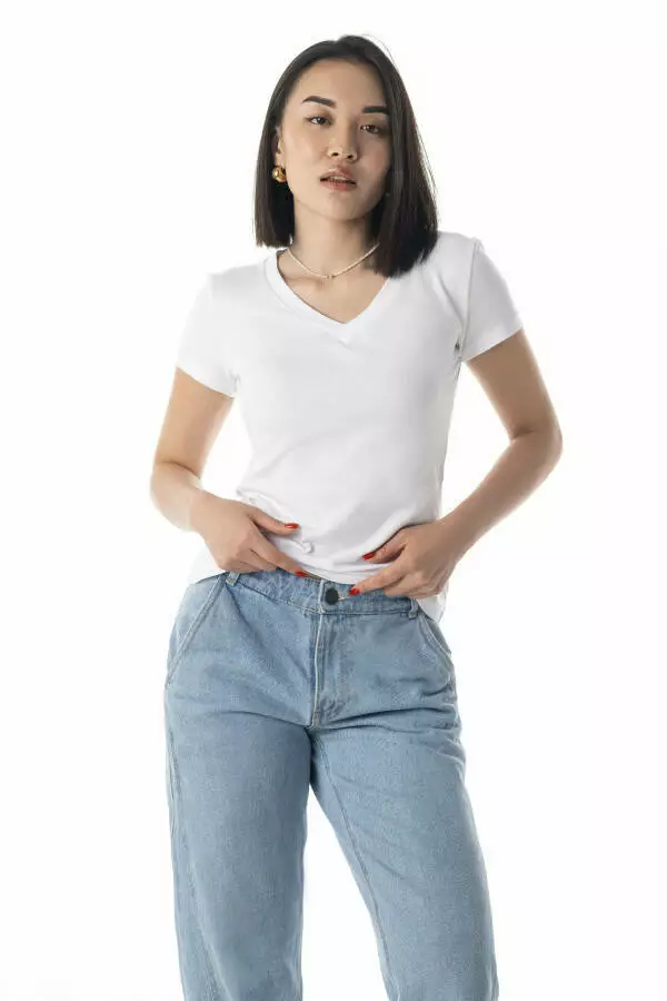 Жіноча футболка з V-подібним вирізом стане основою вашого гардеробу, підійде для будь-яких подій — від роботи до прогулянки з друзями. Поєднуючи її з жакетом чи кардиганом, ви легко створите стильний багатошаровий лук.