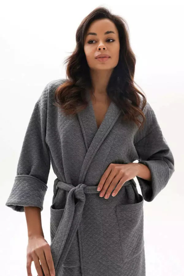 Жіночий халат з стьоганого утепленого трикотажу забезпечує максимальний комфорт і тепло в прохолодні дні. Він виконаний у класичному стилі з поясом для регулювання посадки по фігурі та зручними накладними кишенями для дрібниць.