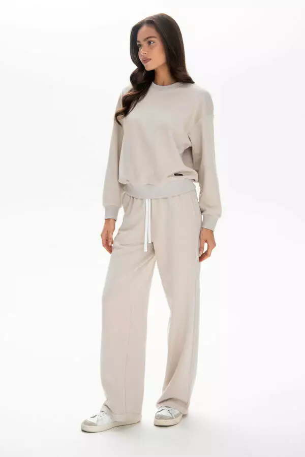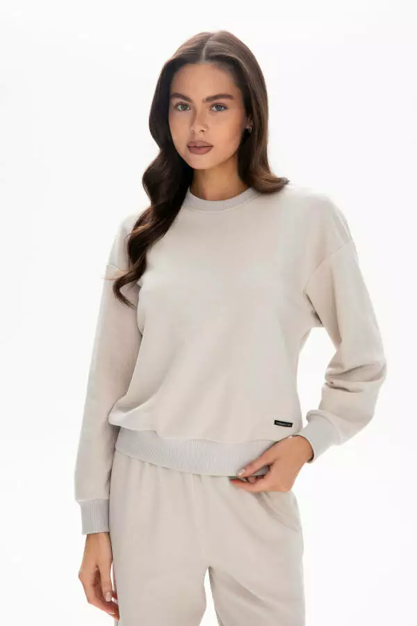 Світшот у стильному відтінку тауп виготовлений із фірмового бавовняного флісу — тканини середньої щільності з легким, «хмарним» відчуттям. Вільний крій не сковує, а еластична структура забезпечує максимальний комфорт щодня.