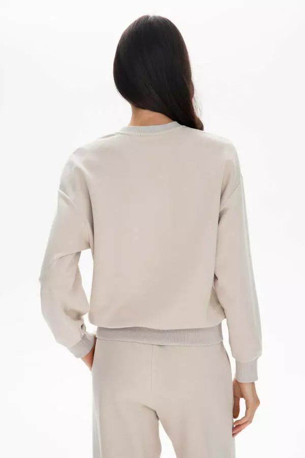 Світшот у стильному відтінку тауп виготовлений із фірмового бавовняного флісу — тканини середньої щільності з легким, «хмарним» відчуттям. Вільний крій не сковує, а еластична структура забезпечує максимальний комфорт щодня.