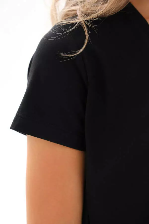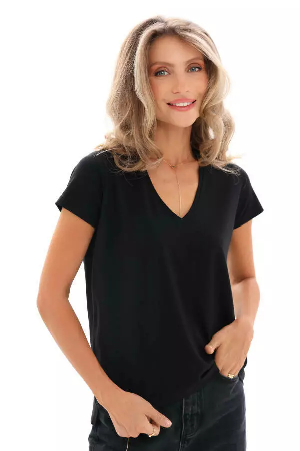 Ця чорна футболка створена з високоякісного модалу (95%) та еластану (5%), що забезпечує неймовірний комфорт і ідеальну посадку. М'яка, ніжна на дотик і дуже дихаюча — вона стане твоєю улюбленою базовою річчю в гардеробі!