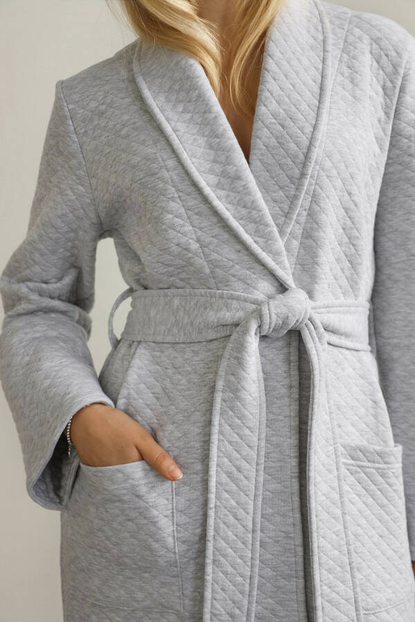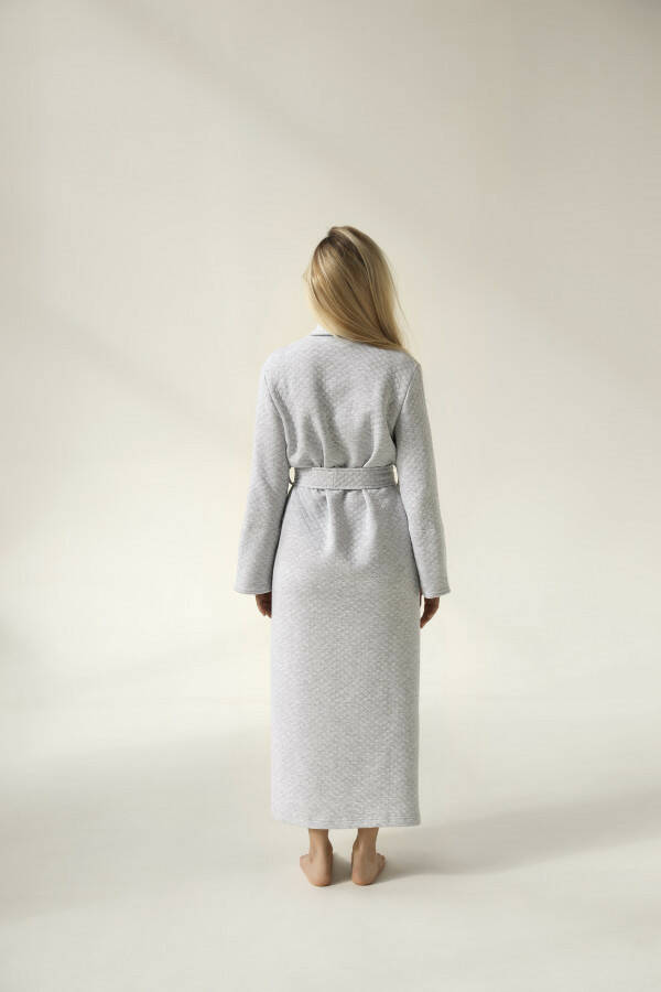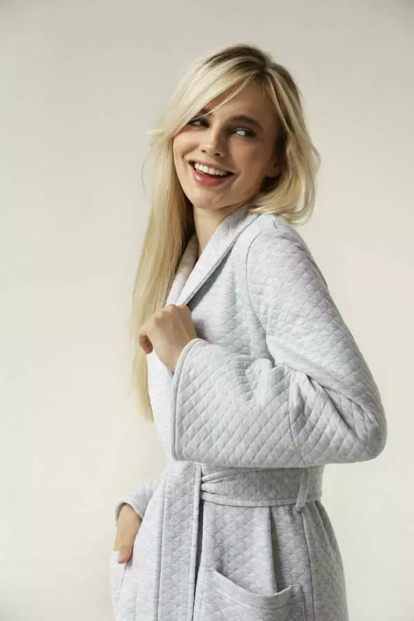 Вишуканий сірий меланж надає халату універсального стилю, який легко впишеться у ваш домашній гардероб. Довжина виробу додає відчуття захищеності та тепла, а зручний крій дозволяє вільно рухатися. Стьобана фактура додає виробу сучасності та робить його ще більш привабливим.