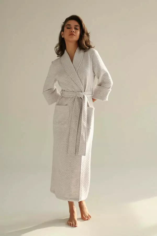 Вишуканий сірий меланж надає халату універсального стилю, який легко впишеться у ваш домашній гардероб. Довжина виробу додає відчуття захищеності та тепла, а зручний крій дозволяє вільно рухатися. Стьобана фактура додає виробу сучасності та робить його ще більш привабливим.