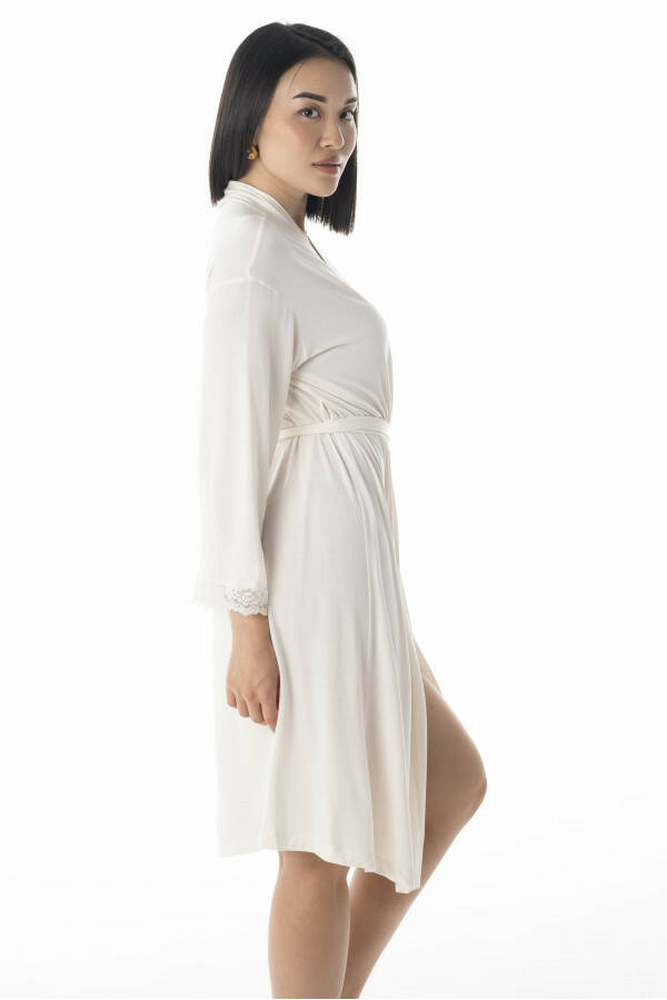 Молочний колір підкреслює ніжність та жіночність, додаючи образу нотку вишуканості. Мереживні вставки створюють романтичний акцент, роблячи халат не лише функціональним, але й стильним. Завдяки своєму елегантному дизайну халат чудово підходить як для ранкових годин із чашкою кави, так і для вечірнього відпочинку вдома.