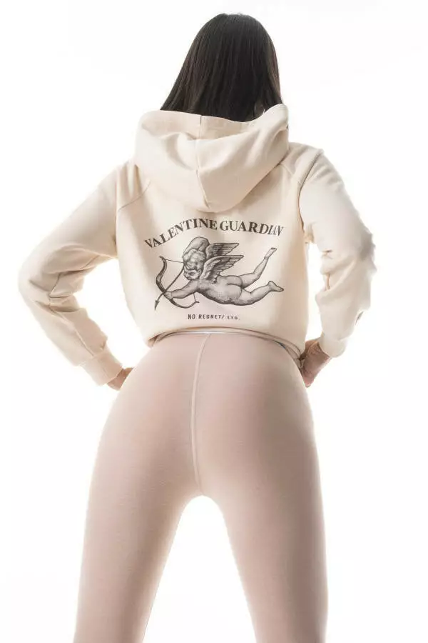 Жіноче худі з капюшоном у бежевому кольорі з принтом ангела “VALENTINE GUARDIAN” — це стильний вибір для тих, хто хоче виразити свою індивідуальність. Виконане з якісного матеріалу, худі забезпечує комфорт і тепло, що робить його ідеальним для прохолодних днів та вечорів. М'яка тканина приємна на дотик, добре зберігає форму та не викликає подразнень на шкірі.