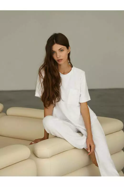 Дизайн костюма продуманий до найменших деталей, щоб ви могли насолоджуватися не лише комфортом, але й стильним виглядом. Білий колір підкреслює витонченість і чистоту образу, додаючи йому нотки елегантності і розкоші. Ви будете почуватися комфортно і впевнено, проводячи час вдома у цьому чудовому комплекті.