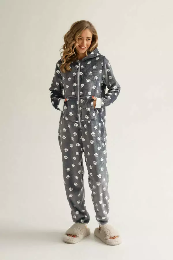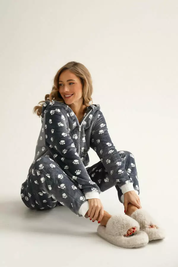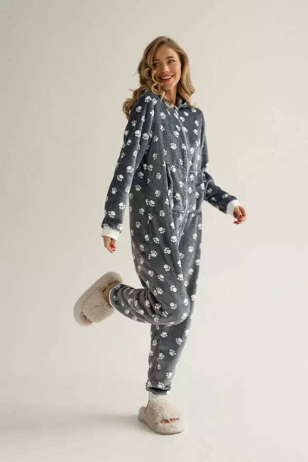 Комбінезон жіночий виготовлений з велсофту, має ніжний сірий колір з милим білім принтом лапок. Комбінезон м'який, зручний і стильний, ідеальний для прохолодних зимових вечорів або затишних сімейних вихідних. Цей комбінезон вигідно підкреслить вашу жіночність і зробить ваш образ неповторним. Догляд за одягом дбайливе прання, віджим на низькиз обертах.