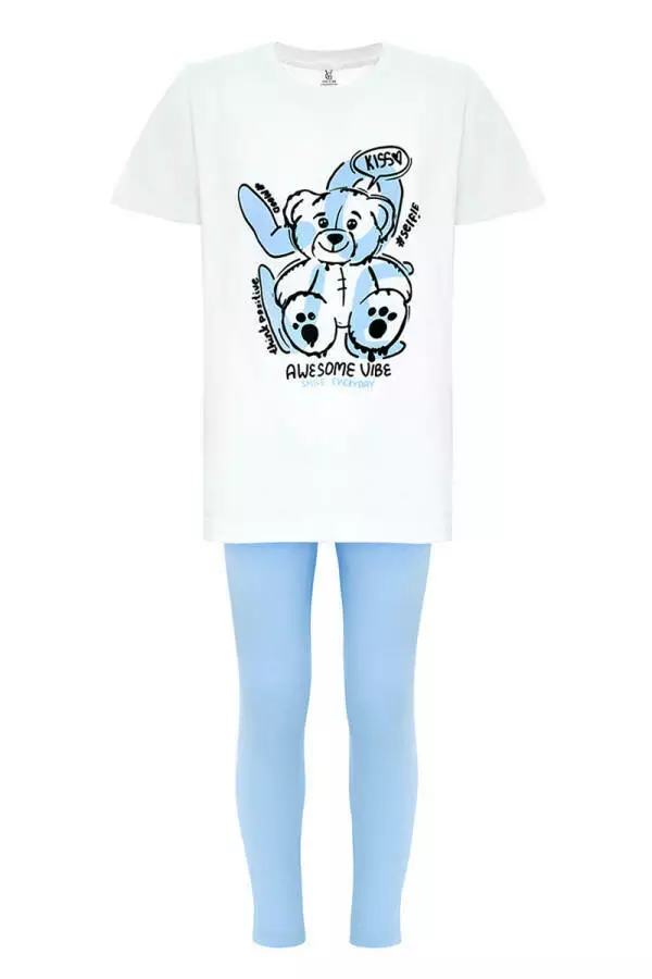Лосини в комплекті виконані у ніжно-блакитному кольорі, що гармонійно поєднується з принтом на футболці. Лосини підходять як для активних ігор, так і для повсякденного носіння, гарантуючи дитині комфорт протягом дня.