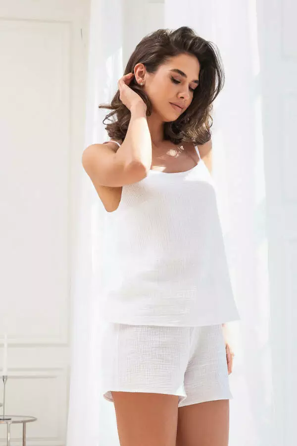 Топ на бретелях та шортах – це стильне та зручне рішення для літнього гардероба. Муслінова тканина забезпечує комфорт і легкість у носінні, що робить цей комплект ідеальним вибором для повсякденного життя або відпочинку на пляжі. Завдяки своєму дизайну цей комплект підходить для різних подій - від прогулянок по місту до вечірніх посиденьок з друзями. Бретеле топа та шорти забезпечують відмінну посадку та комфорт при русі. Завдяки своїй універсальності та стильному вигляду, цей комплект стане чудовим доповненням до літнього гардероба будь-якої модниці.