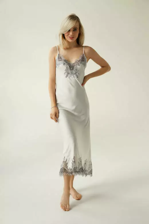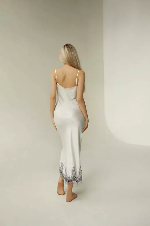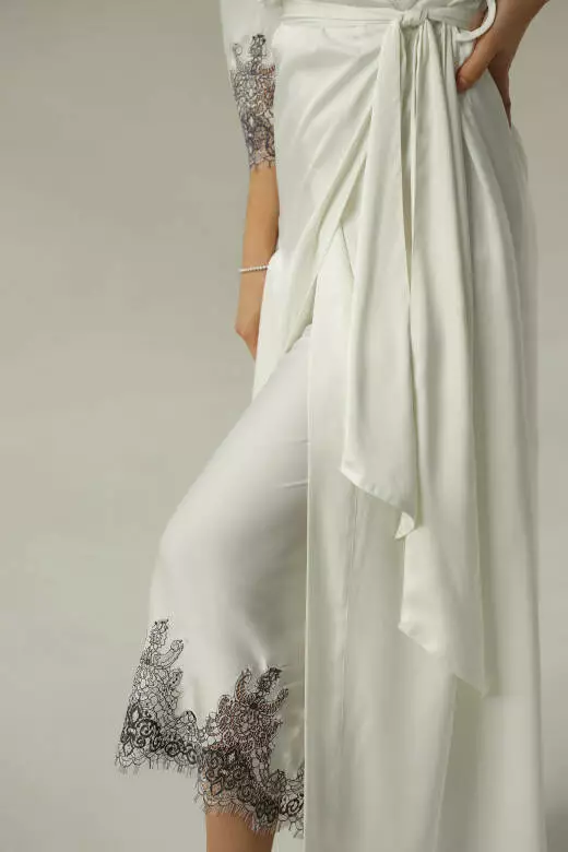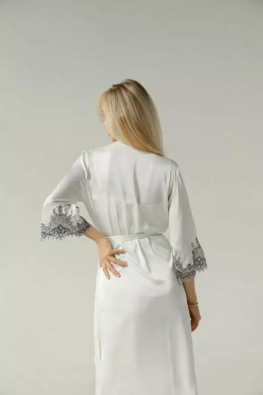 Комплект шовкового халата і сорочки в білому кольорі з контрастним мереживом - це елегантний вибір для вашого гардеробу. Шовкова тканина надає виробам розкішний вигляд, а контрастне мереживо додає їм вишуканості. Цей комплект ідеально підходить для створення романтичного образу вдома або в готелі.