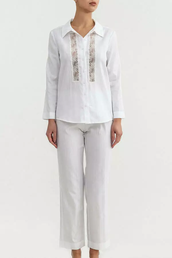 Мереживо, яке оздоблює цей комплект, додає образу витонченості та романтичності, підкреслюючи жіночність та особливий стиль. Ніжні мереживні деталі надають піжамі елегантного акценту, роблячи її більш святковою та витонченою. Мереживо розміщене так, щоб не викликати дискомфорту, воно приємне до шкіри та додає естетичної довершеності. Це тонкий, але виразний акцент, який перетворює піжаму на витвір домашнього одягу, підходящий навіть для особливих моментів.