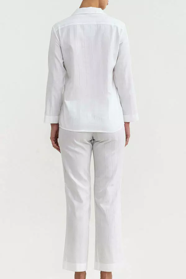 Ця піжама представлена в ніжному, універсальному кольорі, який додає образу витонченості та спокою. Нейтральний відтінок легко поєднується з іншими елементами домашнього гардеробу. Практичність цієї піжами також на високому рівні: натуральна бавовна легко переносить часті прання, зберігаючи колір і форму, навіть після тривалого використання. Вона не втрачає своєї м'якості та не деформується, що робить цей комплект довговічним і зручним для частого носіння. Завдяки якісному матеріалу та продуманому дизайну, ця піжама стає ідеальним вибором для щоденного комфорту та приємного відпочинку.