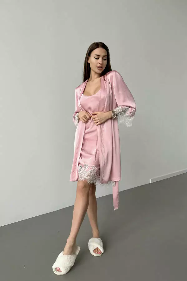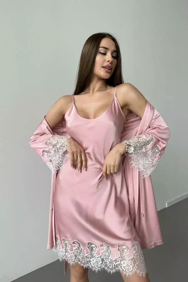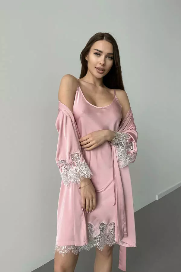 Жіночий комплект шовковий з мереживом, халат і сорочка – це