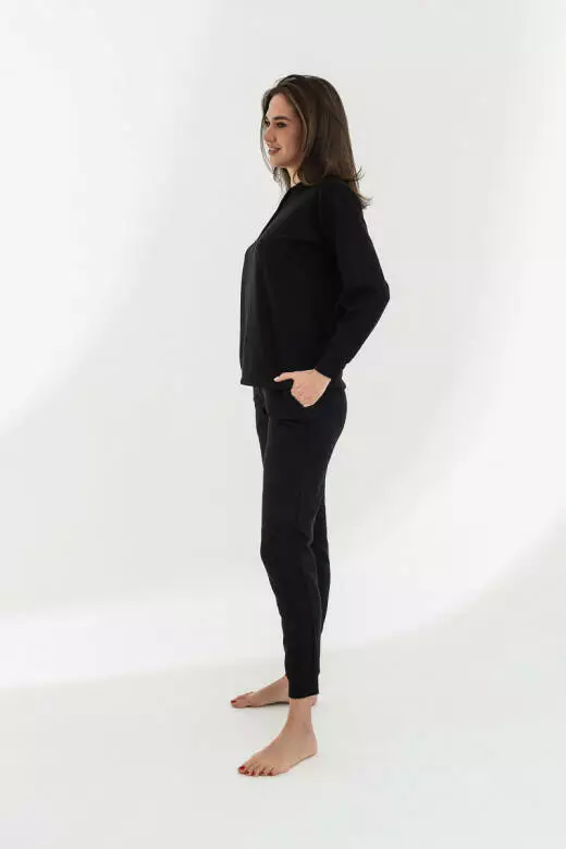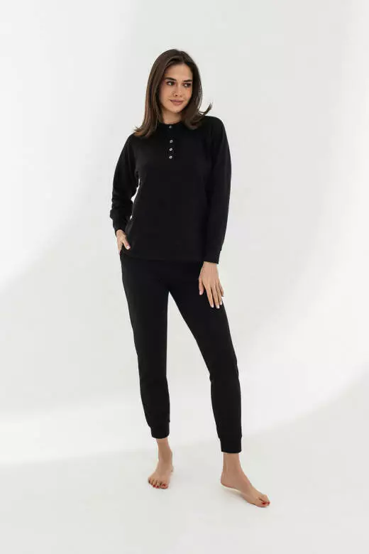 Цей домашній утеплений жіночий костюм - ідеальний вибір для затишних вечорів. Кофта з невеличким круглим розрізом та світлими ґудзиками світлі ґудзики та манжет створюють неповторний стиль. Штани на високій посадці на ризниці з світлим шнуром створює ніжний та зручний образ. Матеріал тканини бавовни (вафельної структури, з начосом) - 80% бавовна, 20% поліестер, цей костюм надає вам тепло та комфорт. Матеріал забезпечує приємний контакт зі шкірою та дозволяють вільно рухатися. Підійде на всі типи фігур в наявності є такі розміри(xs,s,xl). Три варіанти кольорів - бежевий, мокко та чорний - дозволяють вибрати той, що вам до вподоби. Ідеальний вибір для невимушених вечорів вдома. Підкресліть свою затишність і стиль в цьому унікальному костюмі.