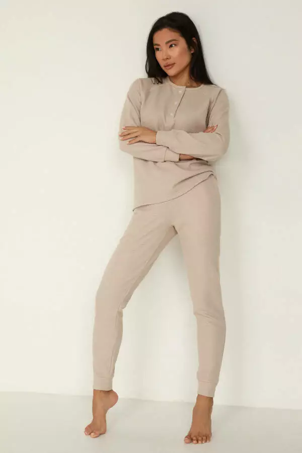 Цей домашній утеплений жіночий костюм - ідеальний вибір для затишних вечорів. Кофта з невеличким круглим розрізом та світлими ґудзиками світлі ґудзики та манжет створюють неповторний стиль. Штани на високій посадці на ризниці з світлим шнуром створює ніжний та зручний образ. Матеріал тканини бавовни (вафельної структури, з начосом) - 80% бавовна, 20% поліестер, цей костюм надає вам тепло та комфорт. Матеріал забезпечує приємний контакт зі шкірою та дозволяють вільно рухатися. Підійде на всі типи фігур в наявності є такі розміри(xs,s,xl). Три варіанти кольорів - бежевий, мокко та чорний - дозволяють вибрати той, що вам до вподоби. Ідеальний вибір для невимушених вечорів вдома. Підкресліть свою затишність і стиль в цьому унікальному костюмі.