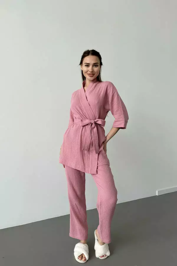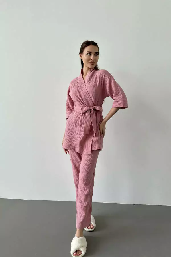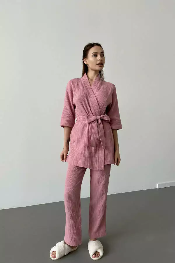 короткий кімоно-халат з поясом і прямі штани. Виготовлений з