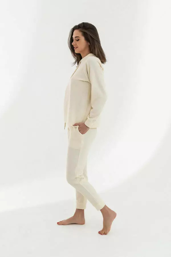 Відкрийте для себе незрівнянний комфорт і стиль з нашим новим утепленим домашнім костюмом для жінок, який включає реглан та штани. Цей жіночий домашній костюм створений для тих, хто цінує тепло, затишок і елегантність у кожній деталі. Він стане вашим незамінним супутником у прохолодні вечори та ранки, даруючи відчуття тепла і комфорту.