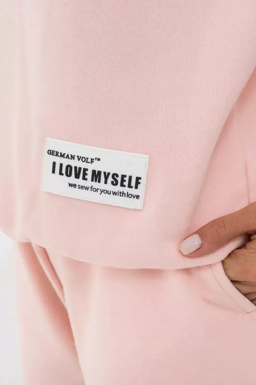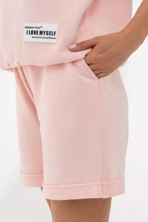 Стильний костюм кольору рожевий кварц, є невідʼємною частиною базового гардеробу. Модель виконана з трикотажної тканини, склад якої (30% поліестер, 70% бавовна), натуральний матеріал добре дихає і випаровує вологу в теплу погоду,що підвищує рівень комфортного носіння на кожен день. Також нашитий логотип білого кольору бренду знизу з написом «I love my self». Розміри доступні для замовлення ( xs,s,m,l ). Кофта з капюшоном, який регулюється білими шнурками прямого крою з коротким рукавом, підходить для спокійних днів вдома, так насичений днів у дорозі. Шорти прямого крою з підкатами, які ідеально сядуть на вашій талії з допомогою шнурка світлого кольору. Висока посадка та дві кишені по боках додають зручності вашому образу. Цей костюм точно стане одним із Ваших улюблених предметів гардеробу.