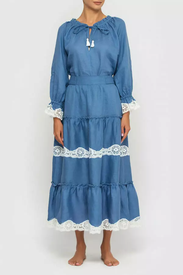 Костюм в стилі бохо з лляної спідниці та блузи з мереживом