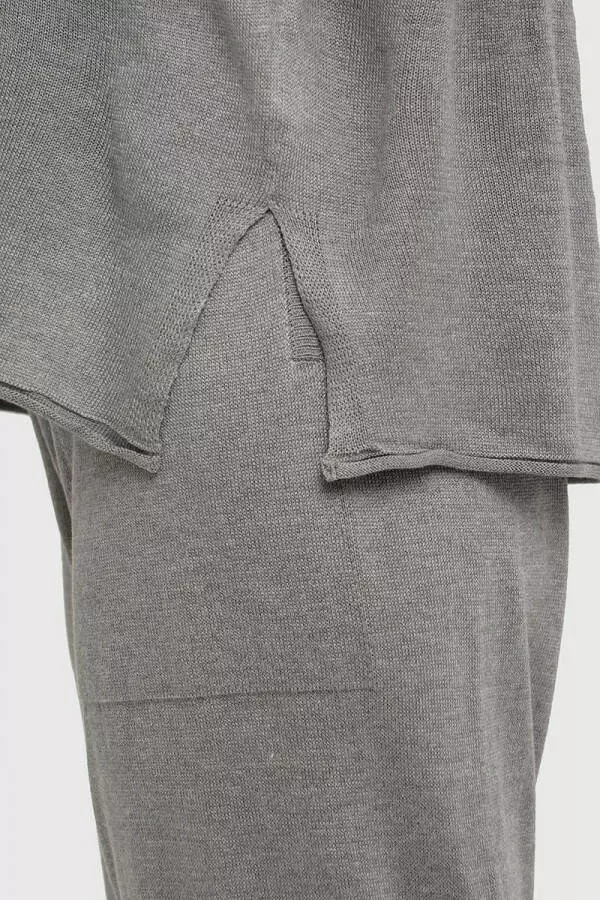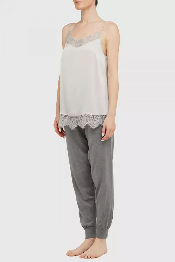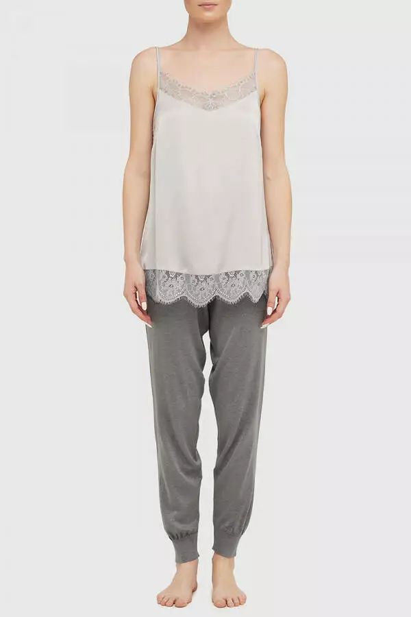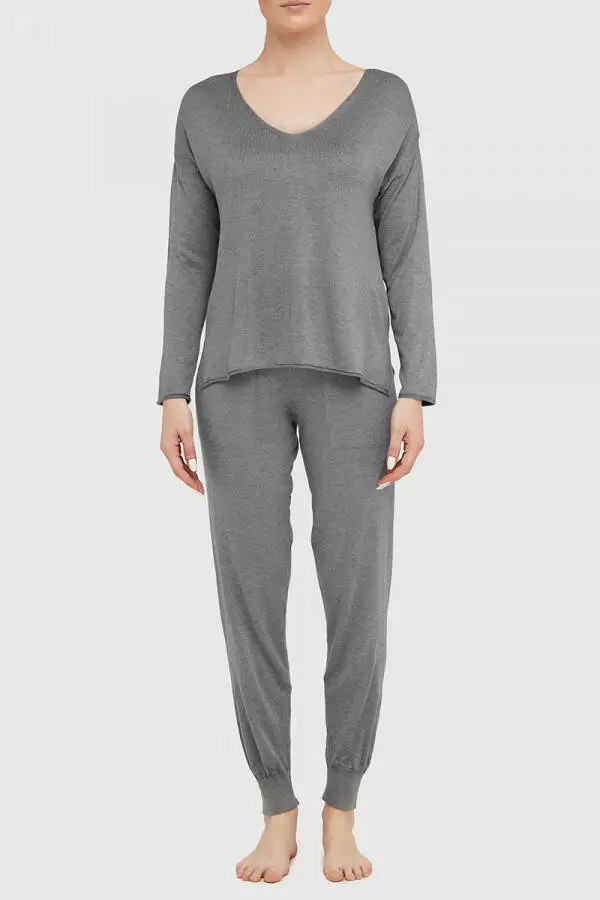 Пуловер з довгим рукавом та V-подібним вирізом, топ шовковистий з мереживним оздобленням. Довгі штани з регульованим еластичним поясом на зав'язках. Є бокові кишені. Манжети оздоблені по краю. М'яка на дотик тканина.