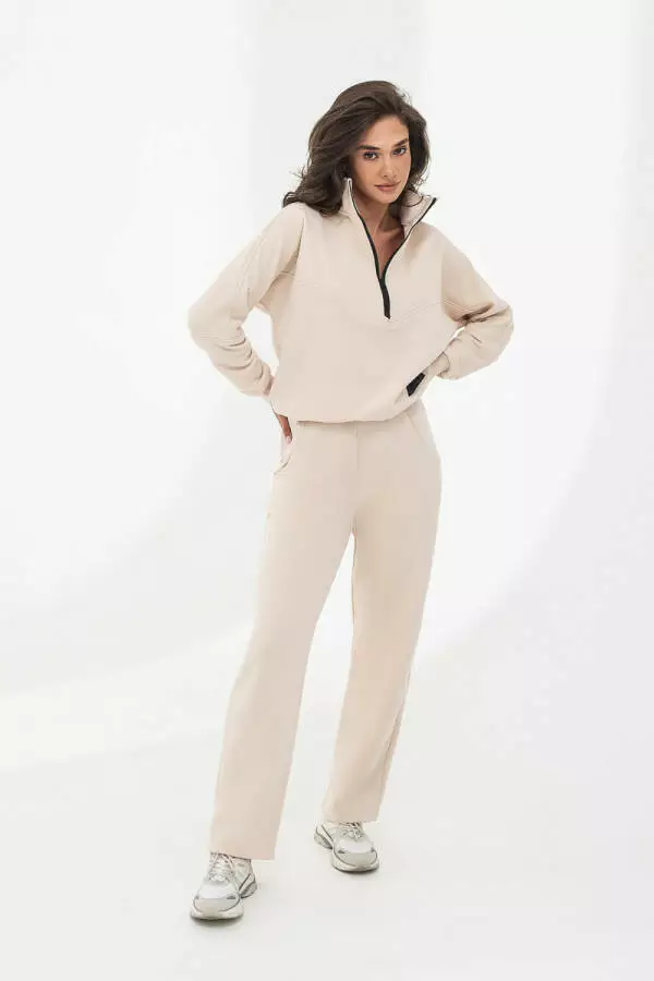 Жіночий спортивний костюм для щоденного використання від відомого бренду German Volf. Ця зручна модель в спортивному стилі підкреслить вашу ніжність і жіночність, виділяючи вас з натовпу. Штани та кофтинка-анорак бежевого кольору доступні в усіх розмірах для замовлення. Костюм зручний і комфортний, вільного крою, виготовлений з трикотажу зі складом 80% бавовни і 20% поліестеру. Широкий ворот з сріблястою блискавкою робить ваш образ дуже стильним. Штани з двома кишенями та резинками біля гомілки створюють обʼємний образ. Натуральна тканина відводить зайву вологу та добре утримує тепло, пропускає повітря. Костюм не кошлатиться і не линяє. Цей бежевий костюм з регланом ідеальний для створення ніжного базового образу, але його також можна поєднувати з іншими елементами гардеробу.