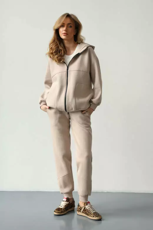 Костюм спортивний, жіночий на флісі утеплений, штани з кокеткою та кофта на блискавці, колір бежевий