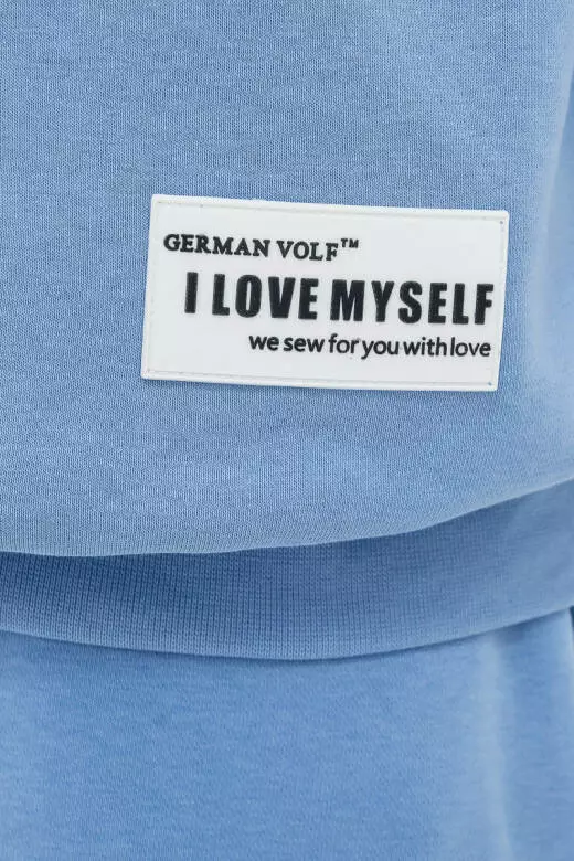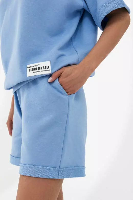 Универсальный костюм блакитного кольору, є невідʼємною частиною базового гардеробу. Модель виконана з трикотажної тканини, склад якої (30% поліестер, 70% бавовна), натуральний матеріал добре дихає і випаровує вологу в теплу погоду,що підвищує рівень комфортного носіння на кожен день. Також нашитий логотип білого кольору бренду знизу з написом «I love my self». Розміри доступні для замовлення ( xs,s,m,l ). Кофта з капюшоном, який регулюється білими шнурками прямого крою з коротким рукавом, підходить для спокійних днів вдома, так насичений днів у дорозі. Шорти прямого крою з підкатами, які ідеально сядуть на вашій талії з допомогою шнурка світлого кольору. Висока посадка та дві кишені по боках додають зручності вашому образу. Цей костюм точно стане одним із Ваших улюблених предметів гардеробу.