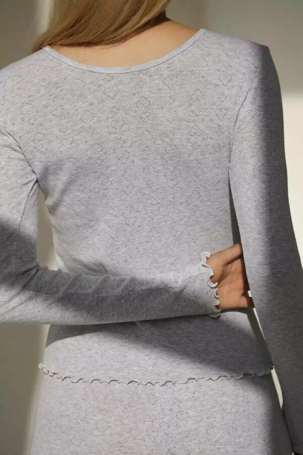 Жіночий лонгслів з довгим рукавом від відомого бренду German Volf виготовлений з ажурного трикотажу з принтом у вигляді сердець - це чудовий вибір для створення стильного образу для дому або сну. Сірий меланж надає йому ніжності та елегантності.