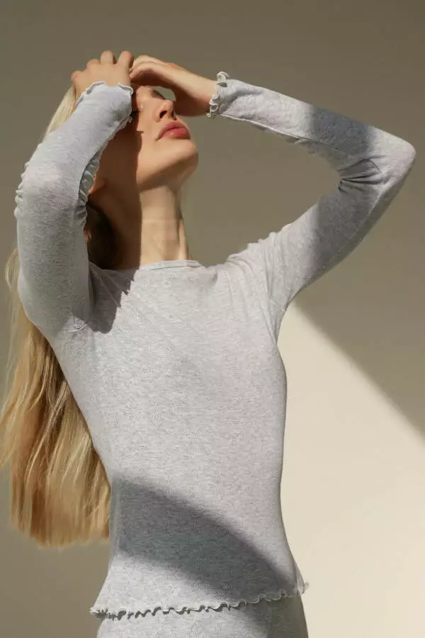 Жіночий лонгслів з довгим рукавом від відомого бренду German Volf виготовлений з ажурного трикотажу з принтом у вигляді сердець - це чудовий вибір для створення стильного образу для дому або сну. Сірий меланж надає йому ніжності та елегантності.
