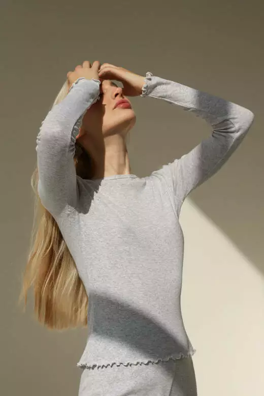 Жіночий лонгслів з довгим рукавом з ажурного трикотажу з принтом у вигляді сердець - це чудовий вибір для створення стильного образу. Сірий меланж надає їй ніжності та елегантності. Зверніть увагу що цю кофту Ви можете доповнити шортами, штанами, футболкою, майкою з цієї тканини. І ви матимете багатофункціональний домашній образ зі 100% бавовни.