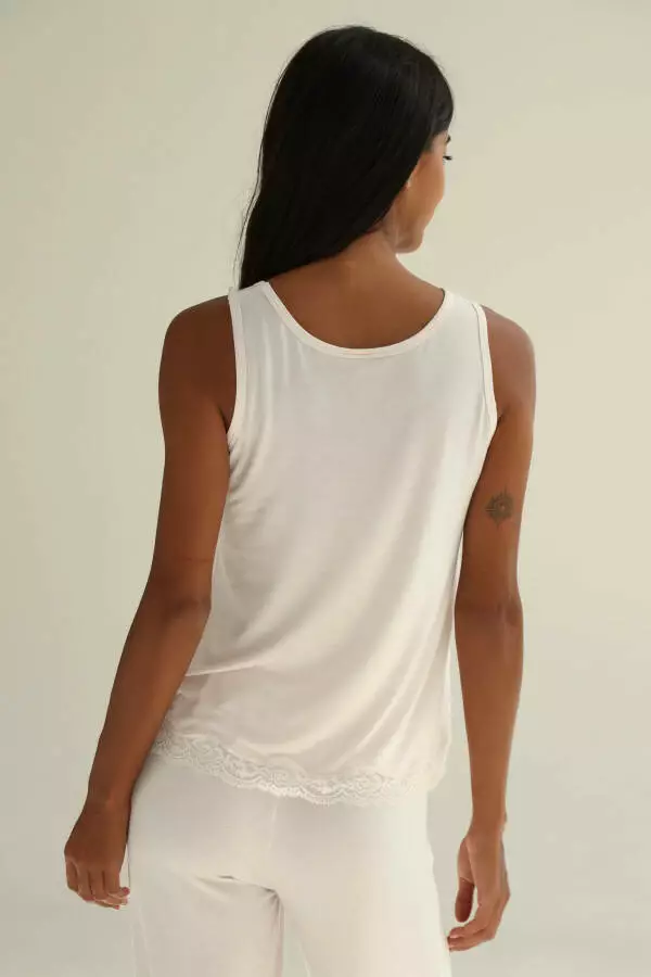 Кремовий колір надає майці особливого шарму, додаючи образу ніжності та спокою. Це універсальний, м'який відтінок, який пасує будь-якому типу шкіри та легко комбінується з іншими елементами домашнього гардеробу, такими як шорти, піжамні штани чи легкий халат. Кремовий колір асоціюється з природністю та затишком, створюючи відчуття тепла й комфорту, що робить цю майку чудовим вибором для релаксу та відновлення сил.