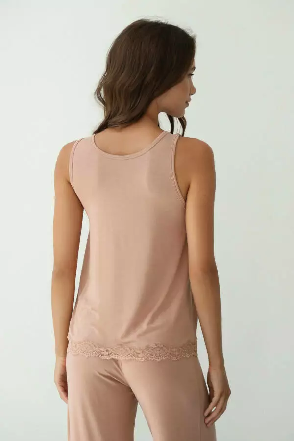 Бежевий колір майки надає їй особливої м’якості та витонченості. Це універсальний відтінок, який підходить для будь-якого тону шкіри та створює атмосферу спокою й затишку. Бежевий колір асоціюється з теплом та натуральністю, роблячи майку ідеальною для домашнього відпочинку. Крім того, ця нейтральна палітра дозволяє легко комбінувати майку з іншими елементами гардеробу, такими як легкі шорти, піжамні штани або халати, створюючи цілісний та стильний домашній образ.