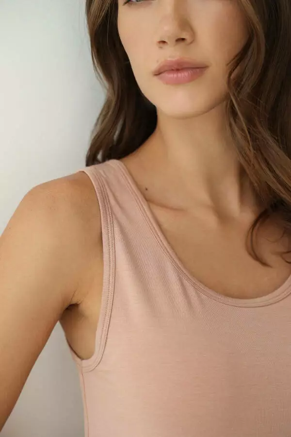 Жіноча майка для сну із модалу в бежевому кольорі від German Volf – це поєднання елегантності, комфорту та ніжності, створене для тих, хто хоче відчувати себе затишно та стильно навіть під час відпочинку. Виконана з м'якого та дихаючого модалу, майка забезпечує приємні тактильні відчуття на шкірі, даруючи комфорт і свіжість протягом усього сну. Модал – це натуральний матеріал, відомий своєю здатністю вбирати вологу, швидко висихати та пропускати повітря, що робить його ідеальним для нічного одягу, забезпечуючи оптимальний температурний баланс.