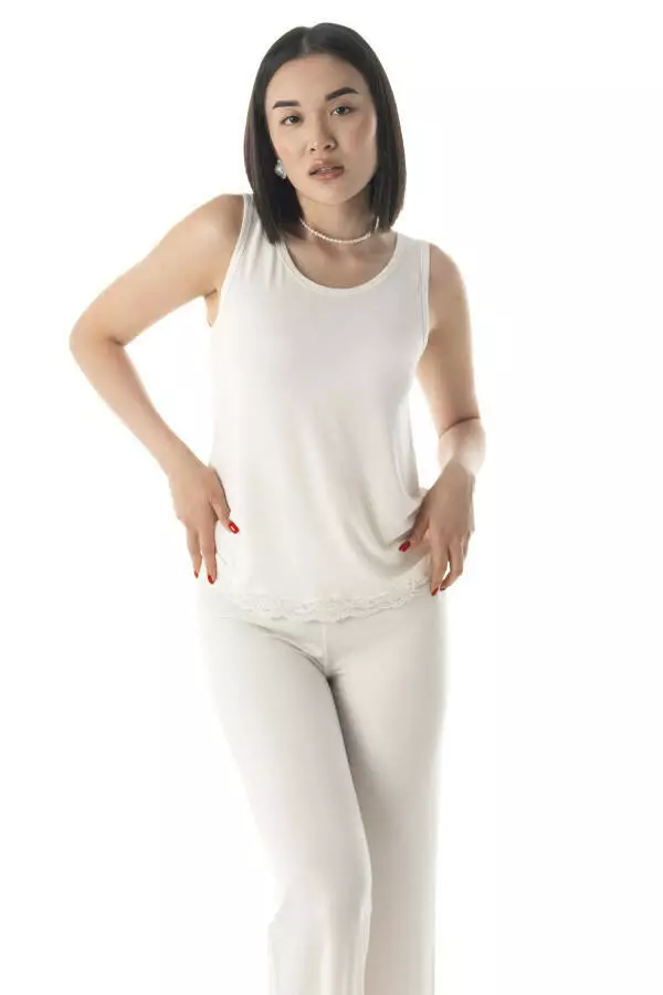 Молочний колір майки додає образу м'якості, спокою та елегантності. Це універсальний відтінок, який гармонійно виглядає на будь-якому типі шкіри, підкреслюючи природну красу та створюючи атмосферу затишку. Молочний колір асоціюється з чистотою і природністю, роблячи майку ідеальною для домашнього релаксу та відновлення сил. Крім того, ця нейтральна палітра дозволяє легко поєднувати майку з іншими елементами домашнього гардеробу – піжамними шортами, штанами чи легким халатом, створюючи стильний і завершений образ.