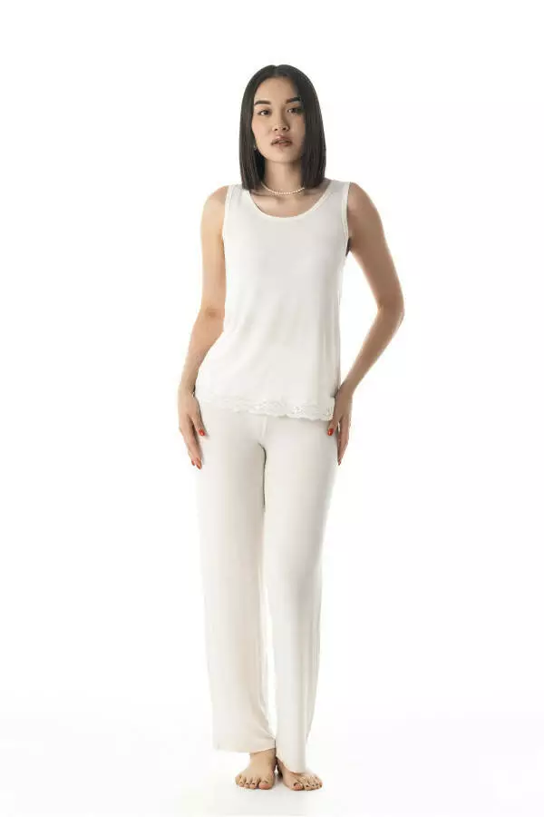 Молочний колір майки додає образу м'якості, спокою та елегантності. Це універсальний відтінок, який гармонійно виглядає на будь-якому типі шкіри, підкреслюючи природну красу та створюючи атмосферу затишку. Молочний колір асоціюється з чистотою і природністю, роблячи майку ідеальною для домашнього релаксу та відновлення сил. Крім того, ця нейтральна палітра дозволяє легко поєднувати майку з іншими елементами домашнього гардеробу – піжамними шортами, штанами чи легким халатом, створюючи стильний і завершений образ.