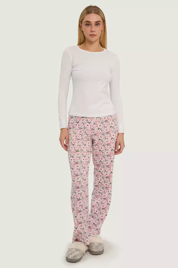 Лонгслів виконаний у мінімалістичному дизайні з довгими рукавами та округлим вирізом горловини, що надає комплекту елегантної простоти та зручності. Завдяки вільному крою, лонгслів не обмежує рухів, забезпечуючи комфорт і свободу під час сну або відпочинку вдома. Білий колір додає образу свіжості й чистоти, а також чудово поєднується з квітковим візерунком на штанах, створюючи ніжний і жіночний вигляд.