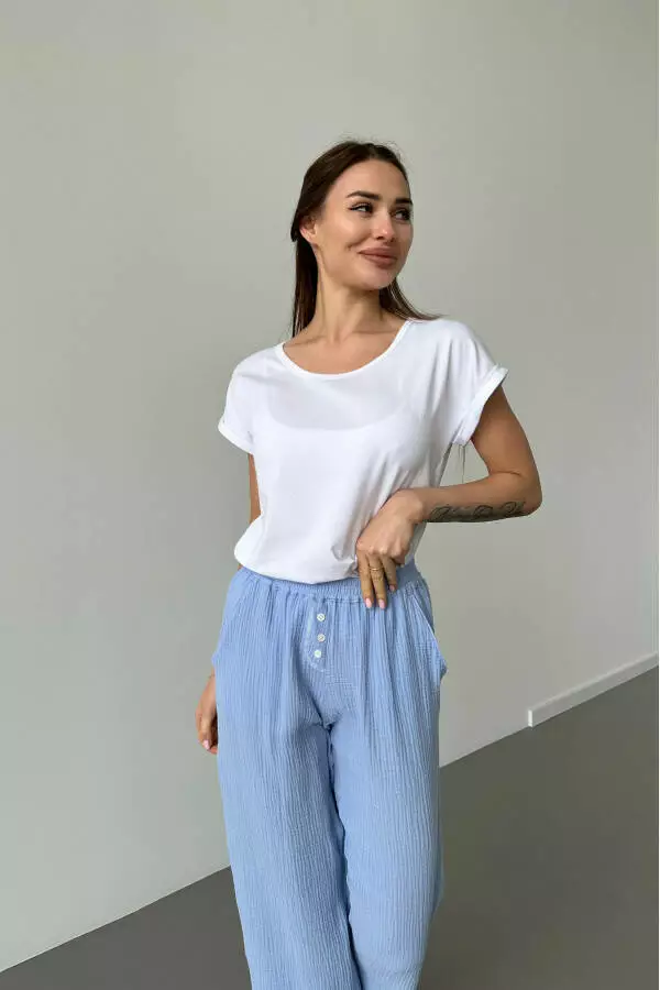 - Тип модели: Піжамний комплект футболка біла та штани муслінові