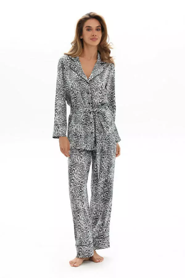 Піжамний комплект із штучного шовку з леопардовим принтом — це комбінація розкіші й зручності. Легка, м'яка до тіла тканина ніжно обіймає шкіру, даруючи відчуття ніжності та прохолоди. Стильна сорочка з довгим рукавом, комірцем і ґудзиками підходить для повсякденного носіння вдома та виглядає елегантно. Прямі штани з еластичним поясом гарантують комфорт і свободу рухів. У комплект входить пояс, який підкреслює силует і дає змогу носити сорочку як легкий халат. Яскравий леопардовий принт додає образу грайливості й жіночності. Цей набір чудово підходить і для сну, і для затишного відпочинку вдома, а також стане стильним домашнім варіантом одягу.
