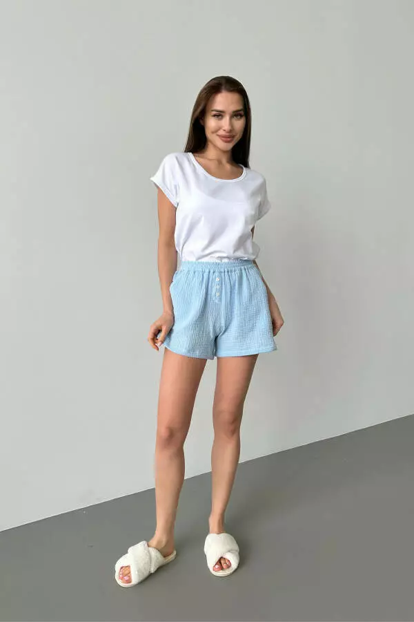 Відкрийте для себе ідеальну комбінацію комфорту та стилю з нашим новим піжамним комплектом жіночий футболка біла та шорти муслінові в кольорі блакитний. Цей комплект — справжня знахідка для тих, хто цінує якість і легкість у домашньому одязі.