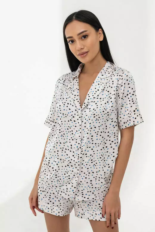 Класичний піжамний костюм із шовковистого матеріалу. Сорочка з коротким рукавом, на гудзиках, та шорти на гумці, з прорізними кишенями. Цей костюм є базовим одягом для сну з жіночним ефектом. Вільний крій і м'якість на дотик роблять їх неймовірно зручними та ідеальними для носіння у будь-яку пору року.