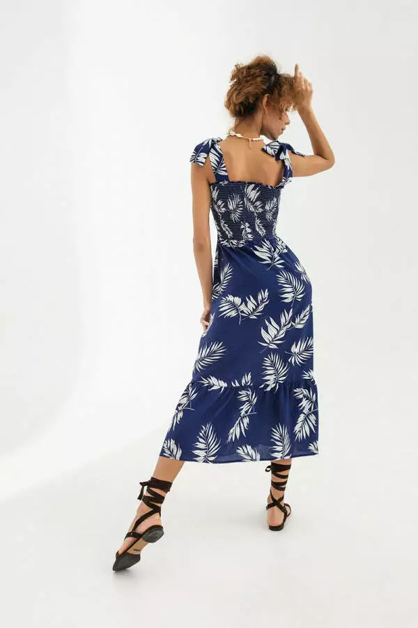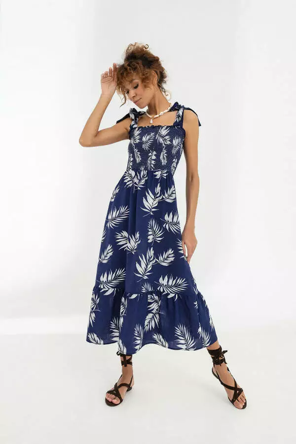 Сарафан довгий з панельної тканини, з принтом листя, підходить як для повсякденного носіння, так і для пляжного відпочинку Верхня частина сарафану, виконана широкою резинкою, не даючи сарафану сповзти з тіла, є зав'язки, спідниця сарафана вільна, з оборкою по низу