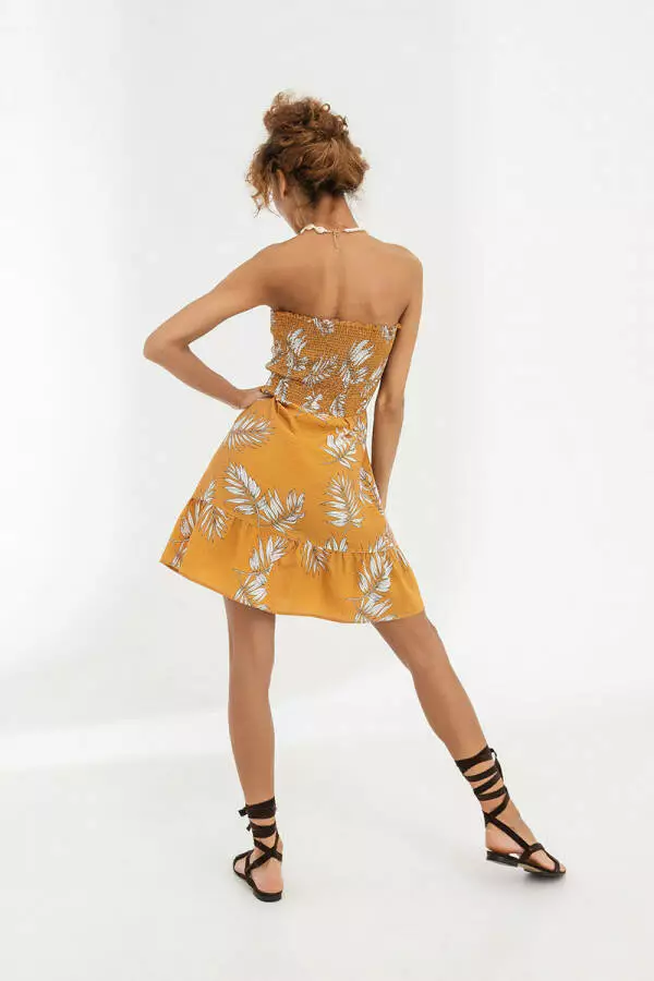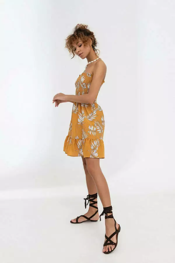 Сарафан із плательної тканини, з принтом листя, підходить як для повсякденного носіння, так і для пляжного відпочинку Верхня частина сарафану, виконана широкою резинкою, не даючи сарафану сповзти з тіла, спідниця сарафана вільна, з оборкою по низу