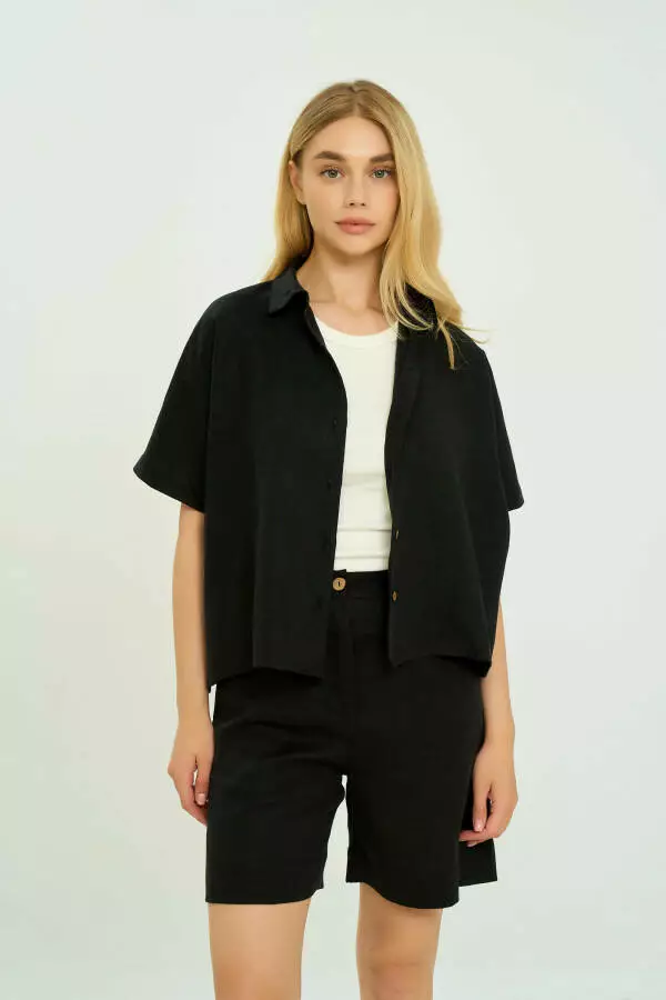 Чорний колір надає шортам елегантності та універсальності. Це класичний відтінок, який легко поєднується з іншими кольорами та стилями, дозволяючи створювати як повсякденні, так і більш формальні образи. Чорний колір також робить шорти практичними, оскільки вони зберігають свіжий вигляд навіть після тривалого носіння. Лляні шорти в чорному кольорі виглядають стильно і стримано, дозволяючи експериментувати з різними поєднаннями та аксесуарами.