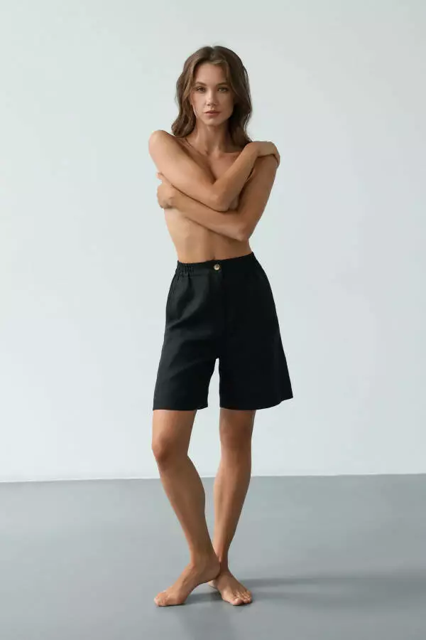 Чорний колір надає шортам елегантності та універсальності. Це класичний відтінок, який легко поєднується з іншими кольорами та стилями, дозволяючи створювати як повсякденні, так і більш формальні образи. Чорний колір також робить шорти практичними, оскільки вони зберігають свіжий вигляд навіть після тривалого носіння. Лляні шорти в чорному кольорі виглядають стильно і стримано, дозволяючи експериментувати з різними поєднаннями та аксесуарами.