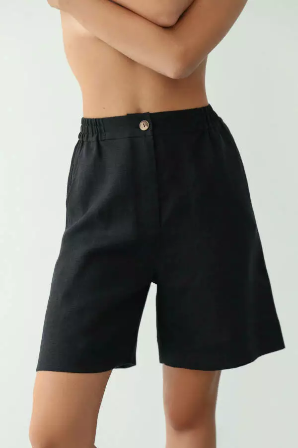 Чорний колір надає шортам елегантності та універсальності. Це класичний відтінок, який легко поєднується з іншими кольорами та стилями, дозволяючи створювати як повсякденні, так і більш формальні образи. Чорний колір також робить шорти практичними, оскільки вони зберігають свіжий вигляд навіть після тривалого носіння. Лляні шорти в чорному кольорі виглядають стильно і стримано, дозволяючи експериментувати з різними поєднаннями та аксесуарами.