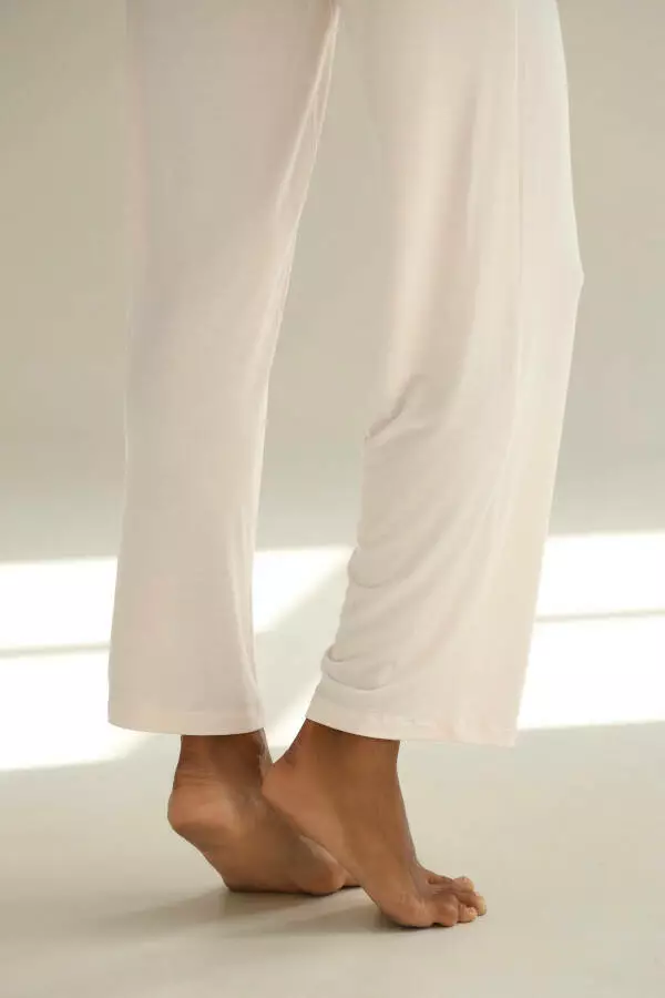 Кремовий колір надає штанам елегантності та робить їх ідеальними для створення затишної атмосфери в домашньому гардеробі. Цей теплий відтінок додає образу м’якості та гармонійно поєднується з іншими кольорами, дозволяючи легко комбінувати штани з піжамними топами, халатами або футболками. Кремовий колір асоціюється з природністю і теплом, що сприяє розслабленню та налаштовує на відпочинок. Він підходить для будь-якого типу шкіри, додаючи образу витонченості та підкреслюючи вашу природну красу.