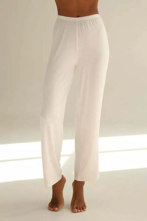 Штани для сну з модалу легко поєднуються з іншими елементами домашнього гардеробу. Вони гармонійно виглядають із топами, майками чи легкими кофтами, дозволяючи створювати стильні комплекти для дому. Завдяки своєму мінімалістичному дизайну, ці штани виглядають елегантно навіть у найпростіших поєднаннях, підкреслюючи ваш смак і відчуття стилю. Кремовий колір додає образу завершеності, дозволяючи відчувати себе доглянутою і витонченою навіть у домашніх умовах.